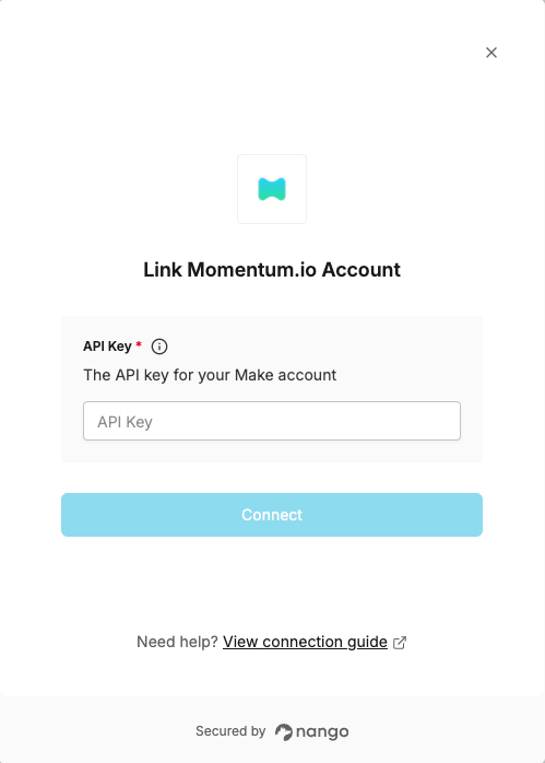 To authenticate with Momentum.io, you will need:- API Key - A key that grants Nango permission to interact with Momentum.io’s API resources and services.